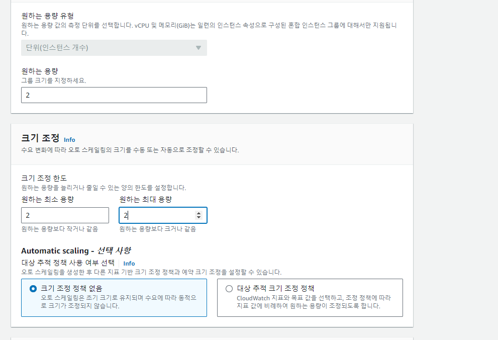 - 최대/최소 /운영을 원하는 인스턴스 숫자 ( 2개 이상이 필요한 스택에서 ec2 하나가 죽었을 때 )