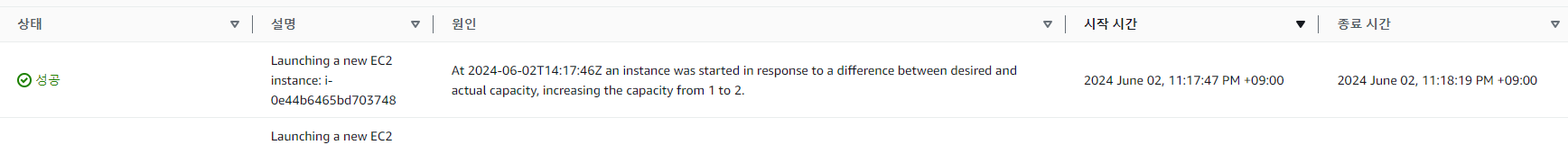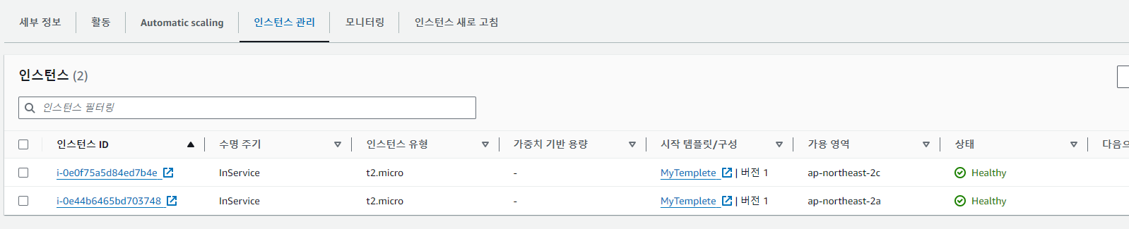 최소인스턴스는 2개로 설정되어 있는데 현재 실행중인 인스턴스가 없으므로 오토스케일링 그룹에서 모니터링하여 자동으로 2개 인스턴스 실행해준다!!