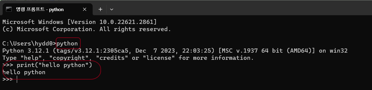 3)Python 설치 확인 : cmd 창에서 다시 python 입력 시 설치된 파이썬 버전 확인 가능!