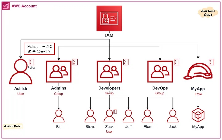 - 정책 (Policy) : 사용자 or 그룹에 정책설정 / JSON 형식으로 정의